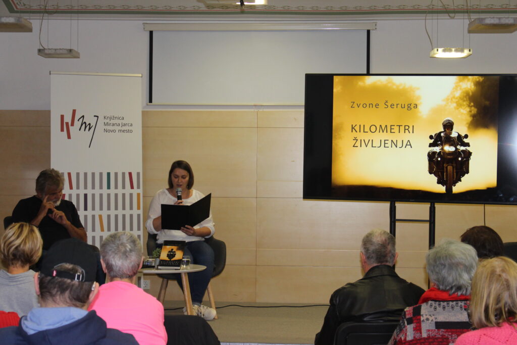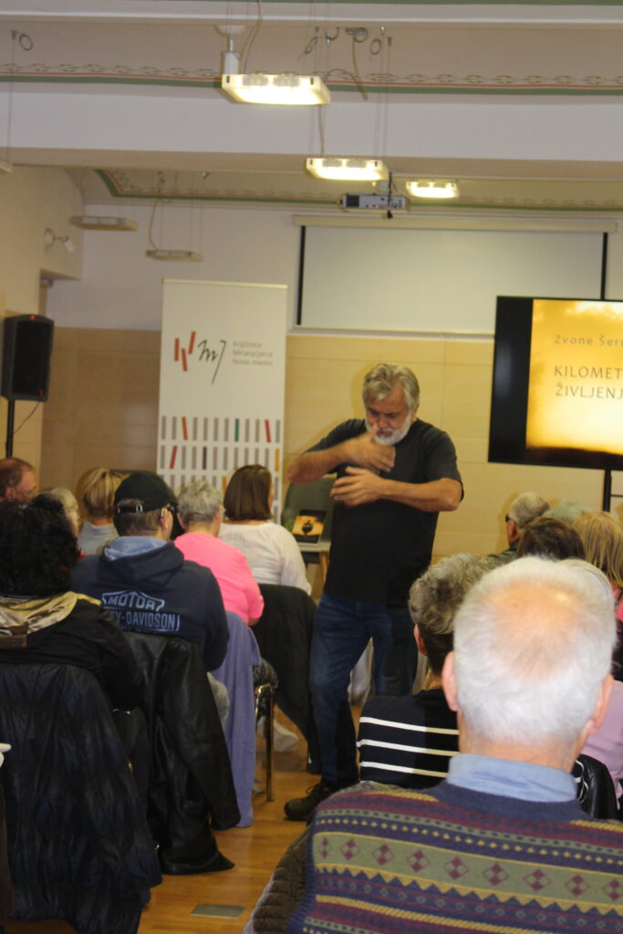 Zadnji novembrski dan smo se odzvali vabilu Bralnega krožka slepih in slabovidnih Beremo tudi v temi. Članice krožka Beremo skupaj RIC Novo mesto smo se pridružile še mnogim, ki smo v Trdinovi dvorani pričakovali svetovnega potnika, novinarja, fotografa Zvoneta Šeruga z zadnjo knjigo Kilometri življenja. Sogovornica Vera Jačimović se je dobro pripravila na pogovor, a je večina odgovorov podal že sam in njena vprašanja niso bila vsa izpovedana. Njegov glas in ognjevitost pripovedi je tudi slepim omogočil videnje njegovih poti. Slikovito, ognjevito je povzel svoje otroštvo in poti po svetu. Spomnil nas je, kako je svoja potovanja predstavljal nam in mnogim Slovencem v velikih dvoranah, ko so bila taka potovanja le sanje mnogih. Zvone je svoje sanje živel, ko je sam in kasneje z družino potoval še naprej. Sedaj vodi posebne skupine v njemu ljubo Namibijo in Etiopijo. S predavanji in knjigami, teh je bilo kar deset, in s fotografijami je zaslužil dovolj, da je dobro živel in na koncu kupil tudi potovalni kombi. Z njim z ženo že potujeta po Evropi in kasneje bosta po Sloveniji. Bralci se veselimo njegovih zgodb o naših ljudeh iz njegovega otroštva, ker so te zgodbe polne ljubezni do ljudi, starih časov in vsega, kar nas je takrat osrečevalo. Z ljubeznijo pripoveduje o vsem, kar smo doživljali vsi v skupnem času naše mladosti. Popotniku želim še veliko moči, zdravja in energije na novih poteh. Pričakujemo nova srečanja.