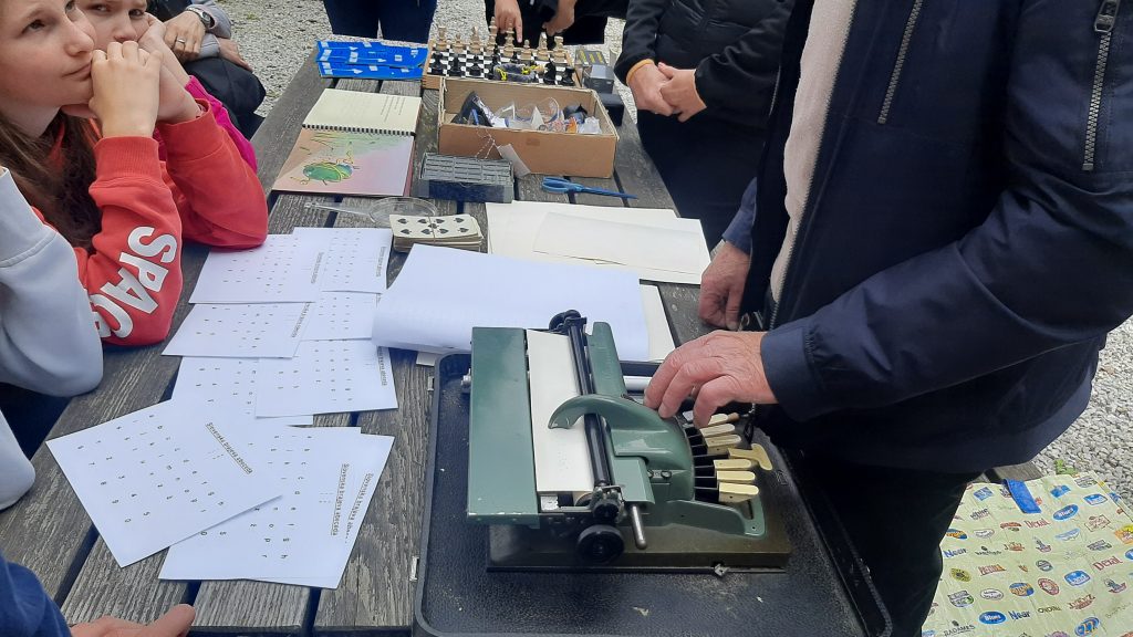 Z brajevo pisavo smo pokazali, kako pišejo in berejo slepi in slabovidni, imeli smo nekaj najosnovnejših tehničnih pripomočkov, ki so nepogrešljivi v življenju na vidu prizadetih oseb, s seboj smo prinesli simulacijska očala, ki pokažejo različne okvare vida.